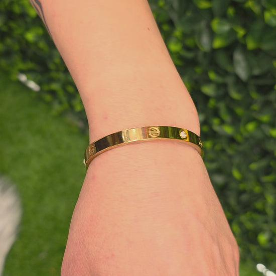 Sophisticated and sparkling, this 18K gold-plated designer bracelet is accented with a Cubic Zirconia (CZ) stone for timeless elegance. Its openable design ensures a comfortable fit for all wrist sizes, while durable 316L stainless steel makes it waterproof, anti-tarnish, and perfect for everyday wear or special occasions.